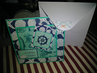 I should have used a fish, anchor or other item for the envelope embellishment, the crab didn’t look right.. I stuck the teal middle layered square in the teal color paper on sideways and didn’t realize until the card was done… Tragic!! It’s okay, no-one else noticed either.. lol